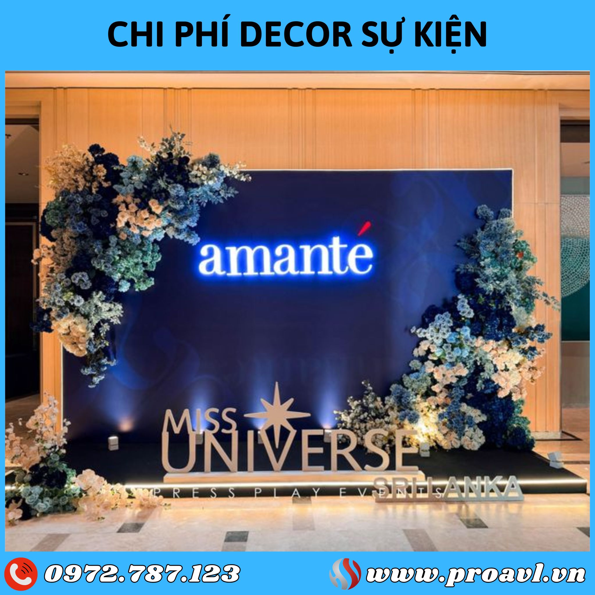 Trang trí sân khấu: Hoa hai bên, backdrop, hiệu ứng ánh sáng.