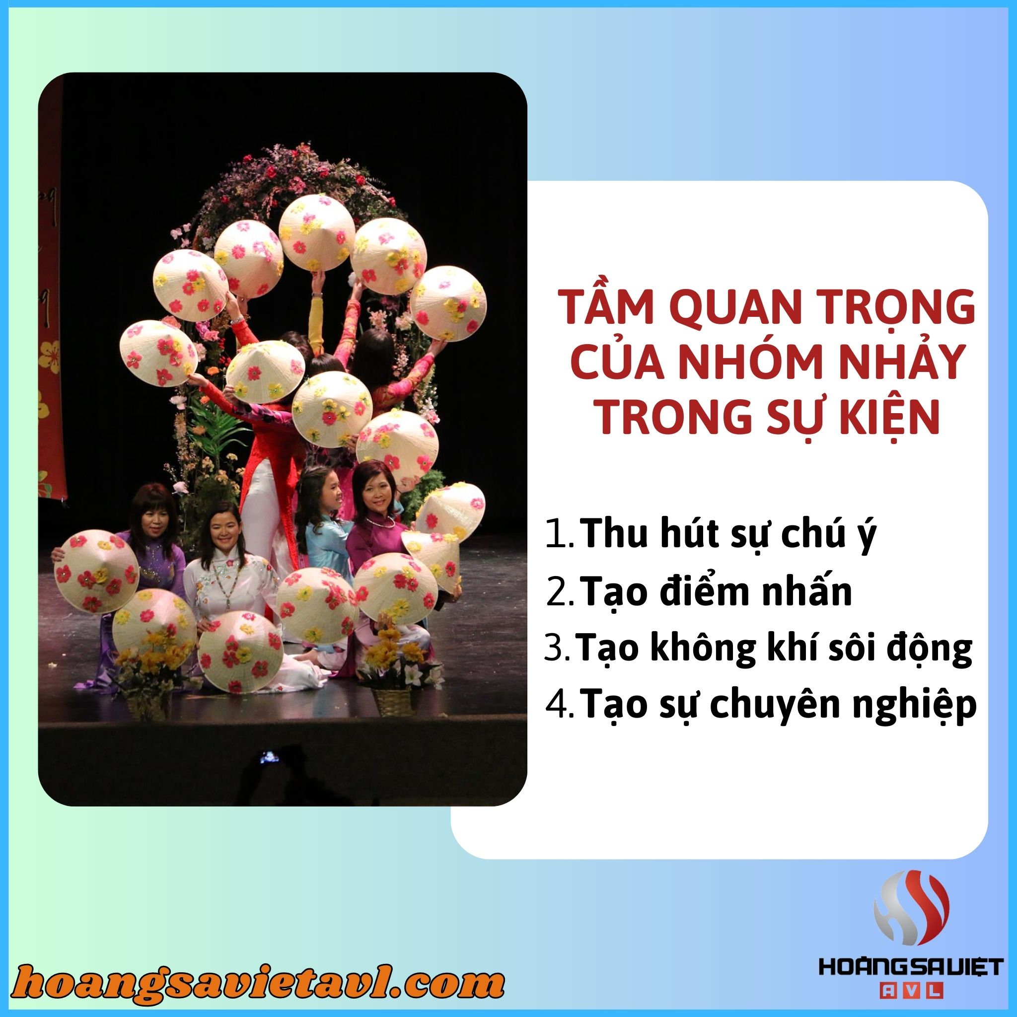 Sự xuất hiện của một vũ đoàn hay nhóm nhảy sẽ tạo điểm nhấn cho chương trình của bạn và giúp làm nổi bật và gây ấn tượng với khán giả.