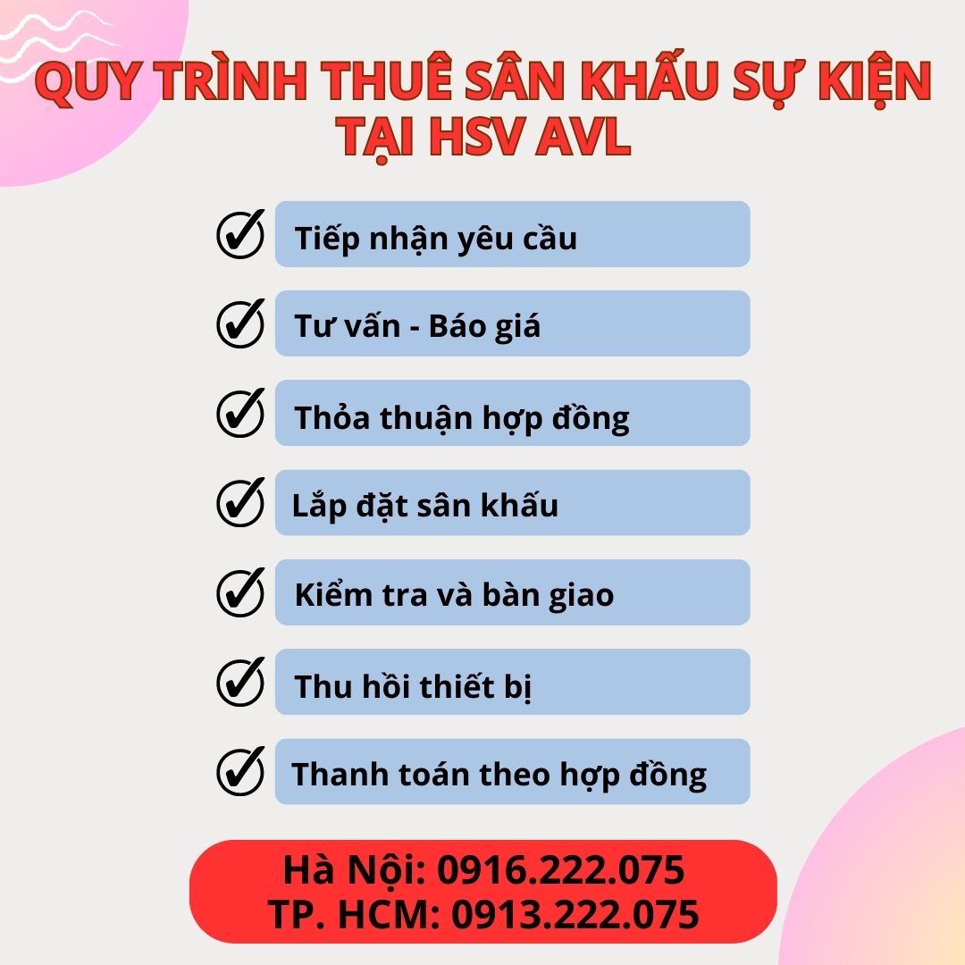 HSV AVL is a unit specializing in event equipment rental in Hanoi. Not only meeting the demand for stage rental in central districts such as Hoan Kiem , Hai Ba Trung , Ba Dinh , Dong Da, Hoang Mai, Thanh Xuan, Tay Ho, but also we also provide mobile assembled stage rental service in suburban districts such as Long Bien, Tu Liem, Ha Dong, Thanh Tri , Gia Lam; Ba Vi district , Soc Son district ,... With a team of experienced and professional staff, we are committed to providing customers with the best service and the most affordable prices for customer events.